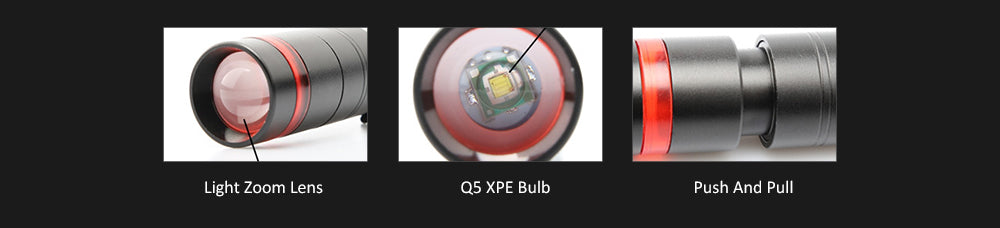 - Componentes emisores de luz: bombilla blanca Q5 XPE de cabeza + bombilla COB lateral
