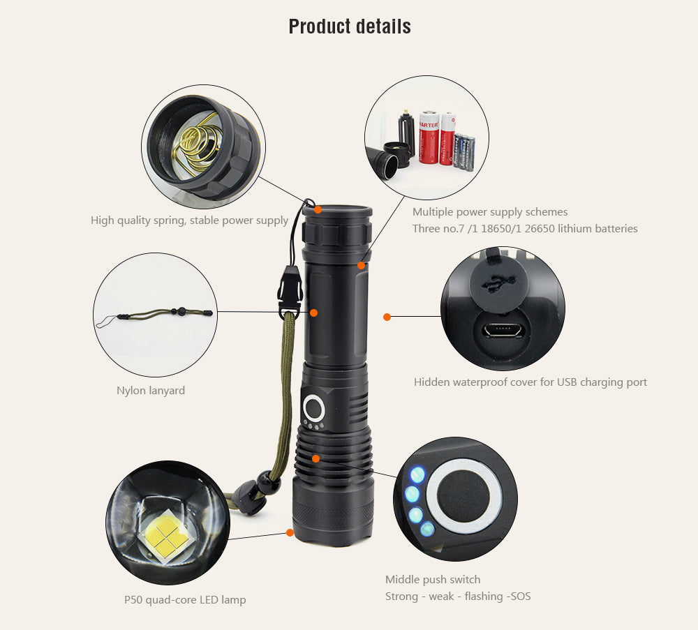 X80 P50 Glare Long-range Outdoor Aluminum Alloy Telescopic Zoom USB Charging Flashlight