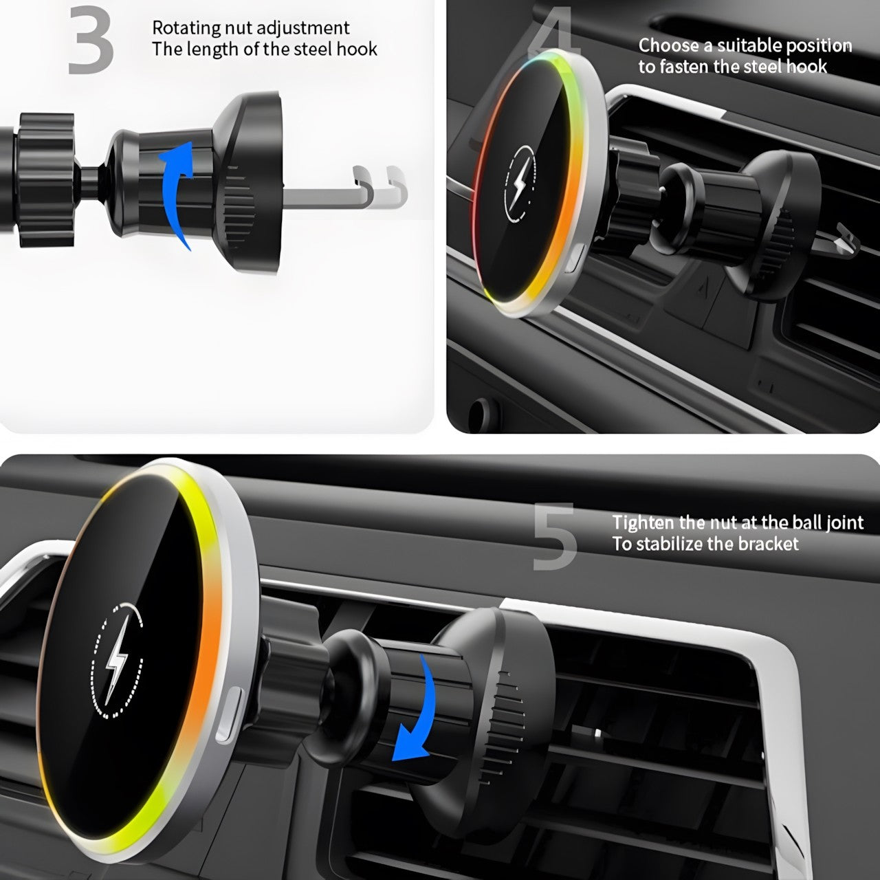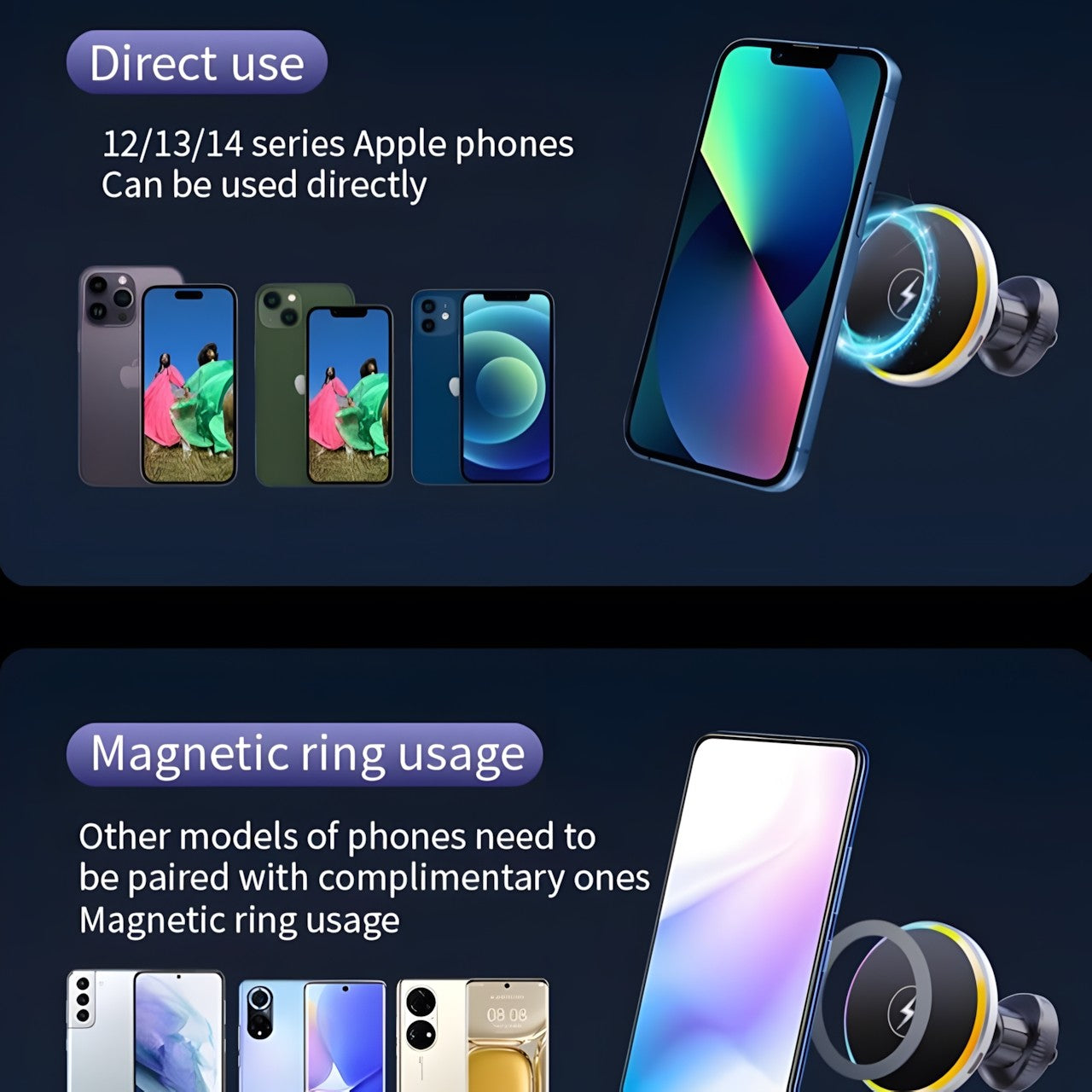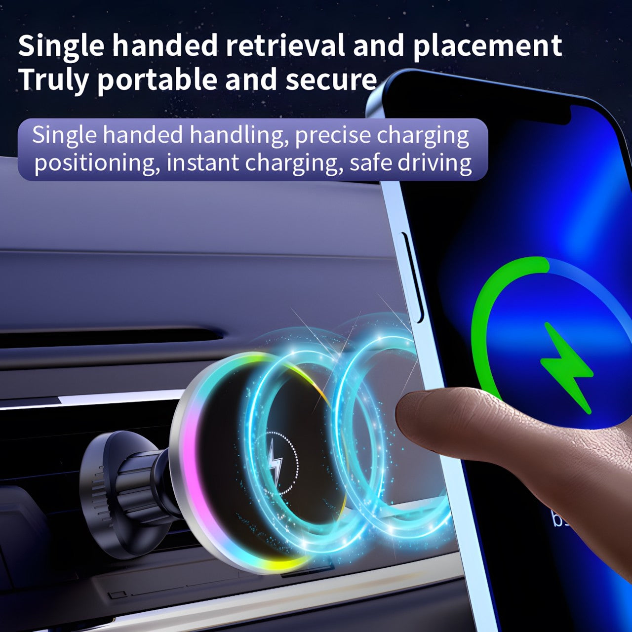 15W Colorful Mini Magnetic Fast Wireless Car Charger Phone Mount - Vibrant LED Lighting, Strong Magnetic Attachment, Car Navigation Stand with Wireless Charging