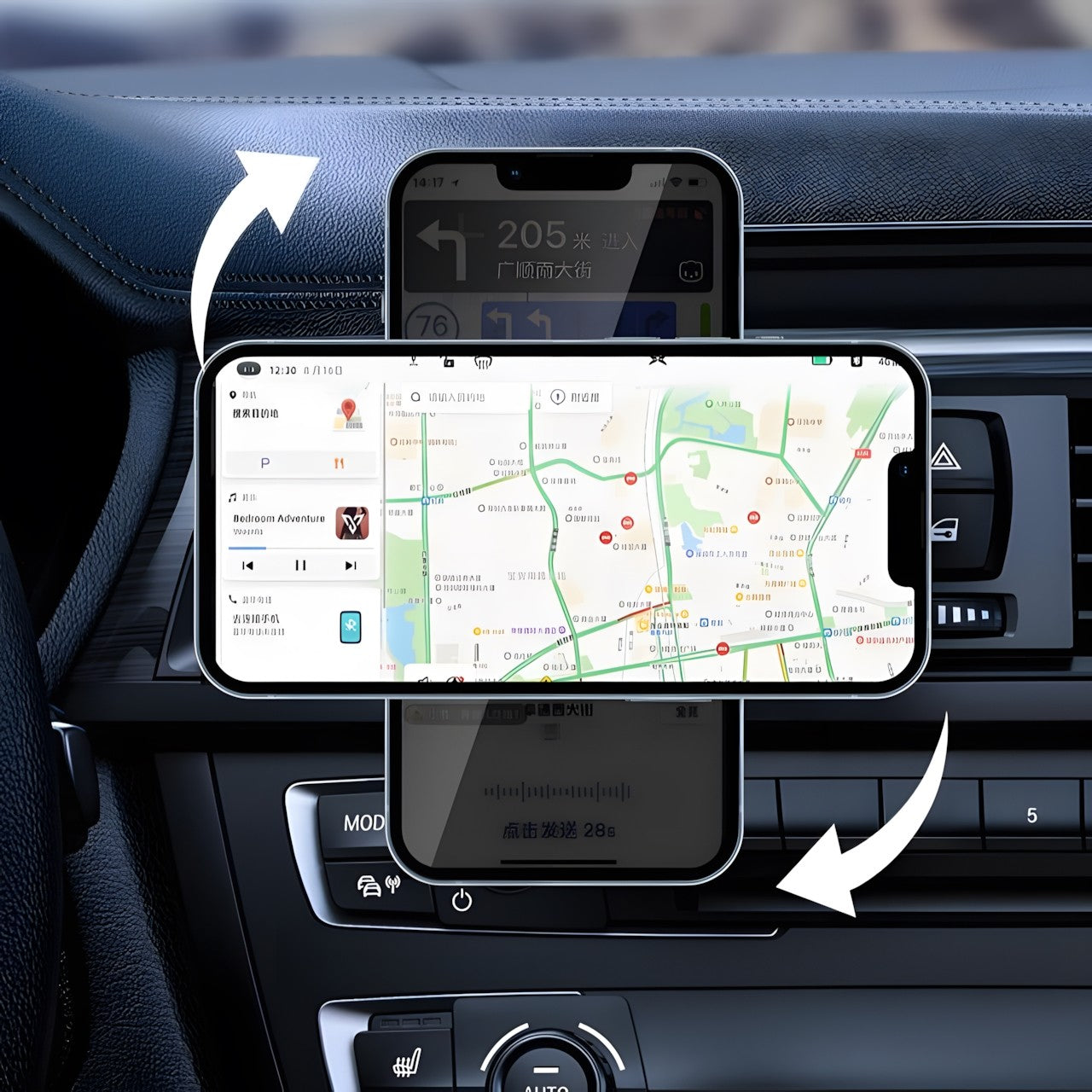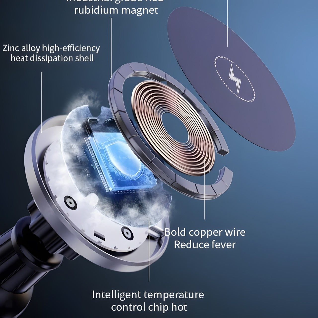 Strong Magnetic Hold: The charger features powerful magnets that securely attach your smartphone to the mount, preventing slips or falls, even on rough roads, for a worry-free driving experience.