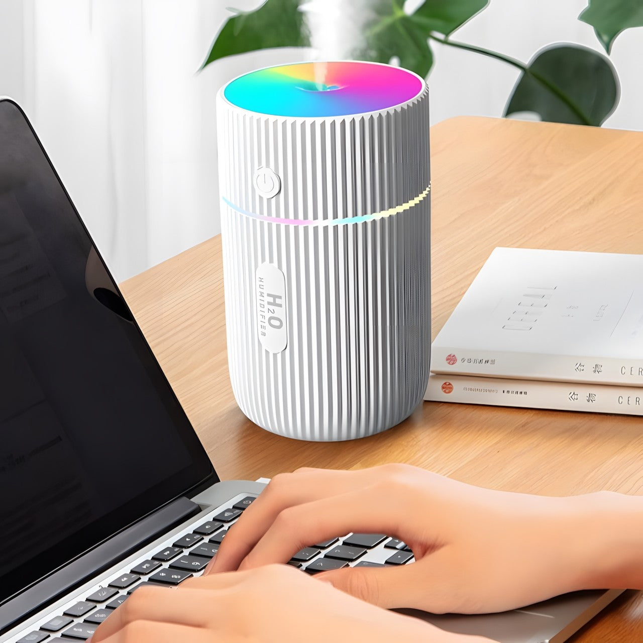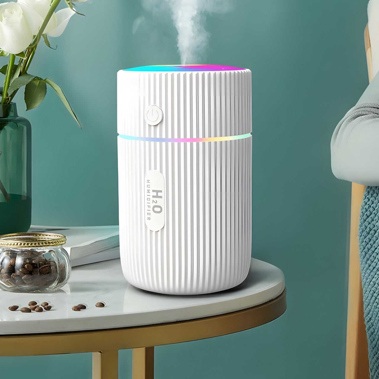 Portable and Stylish Design: The humidifier boasts a modern design with vertical ridges and a sleek profile, making it easy to fit into any decor while being convenient to take on the go, powered by USB for easy charging anywhere.