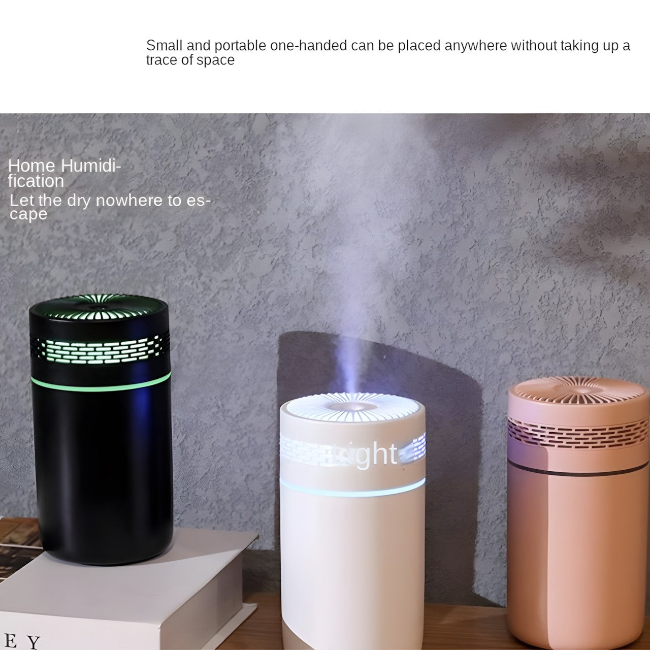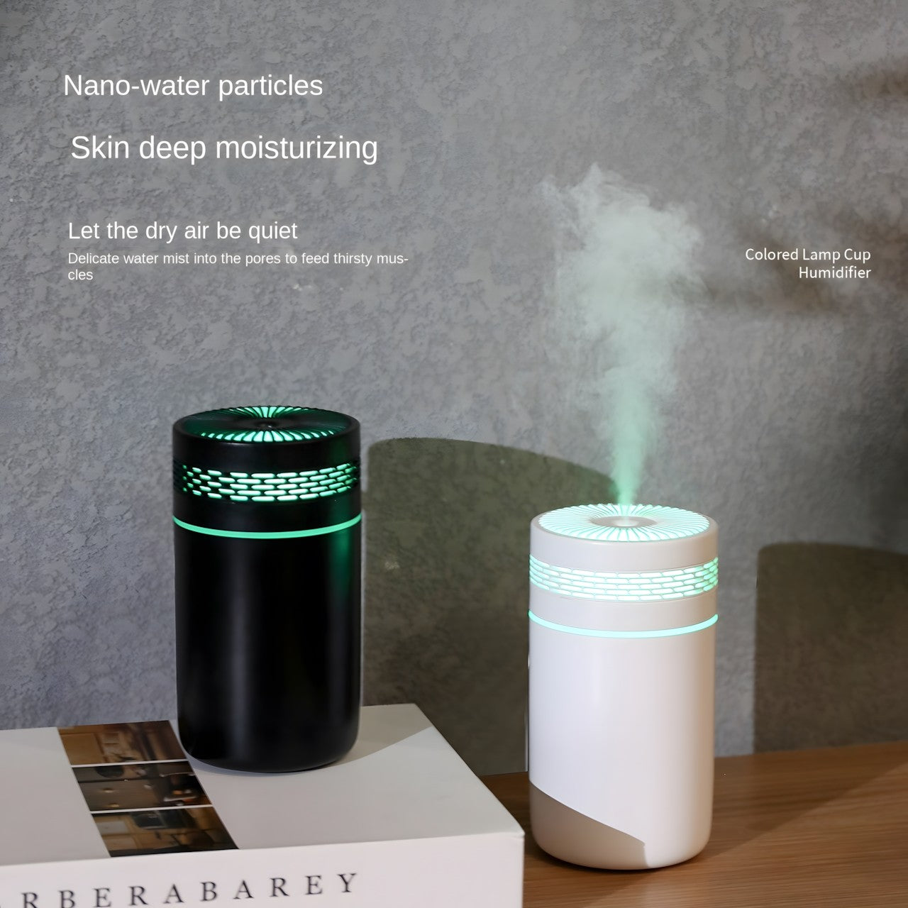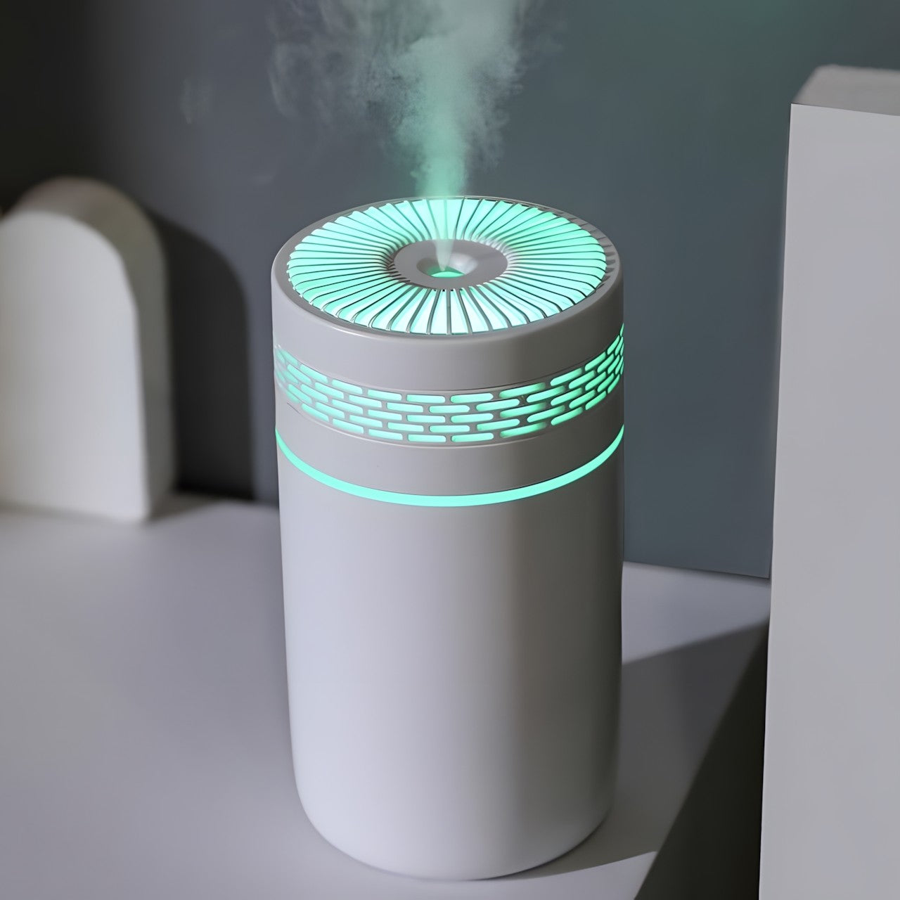 Compact and Portable Design: Designed with portability in mind, this humidifier sports a sleek, cylindrical shape that fits easily on any desk or in small spaces within vehicles or office setups.