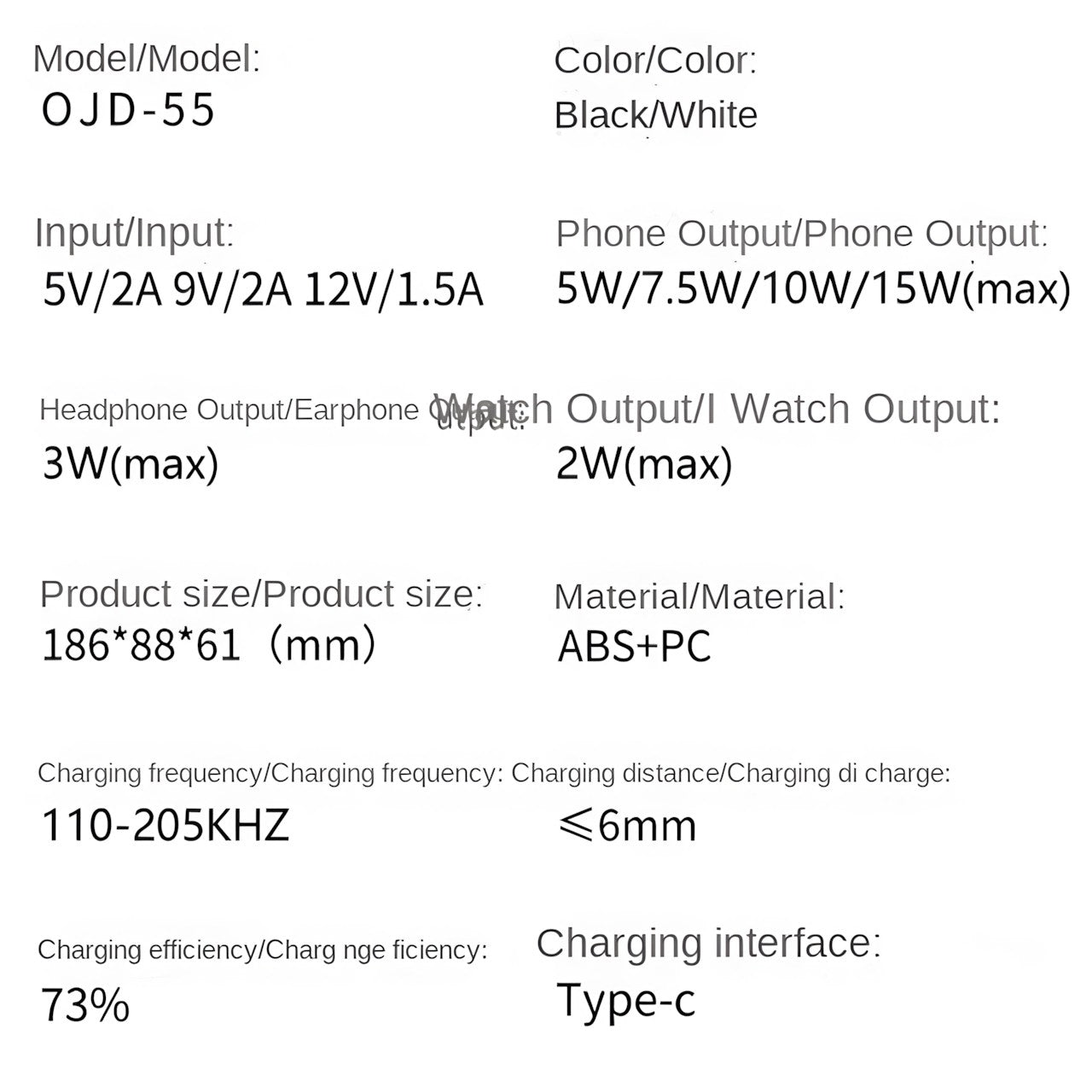 Product highlights: OJD-55 is a three-in-one wireless charger, which eliminates the tediousness of wired charging and plugging; supports wireless charging for mobile phones, earphones and watches that meet QI standards.