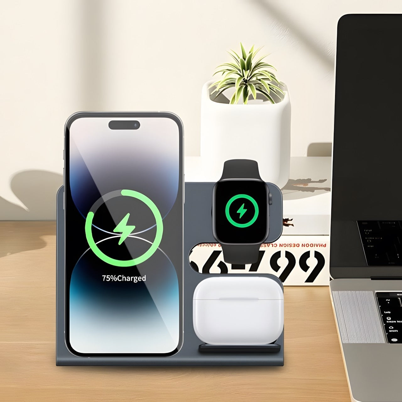 广泛的设备兼容性:这款多功能充电器兼容各种设备,包括智能手机、智能手表和无线耳塞,使其成为您所有小工具的必备配件。