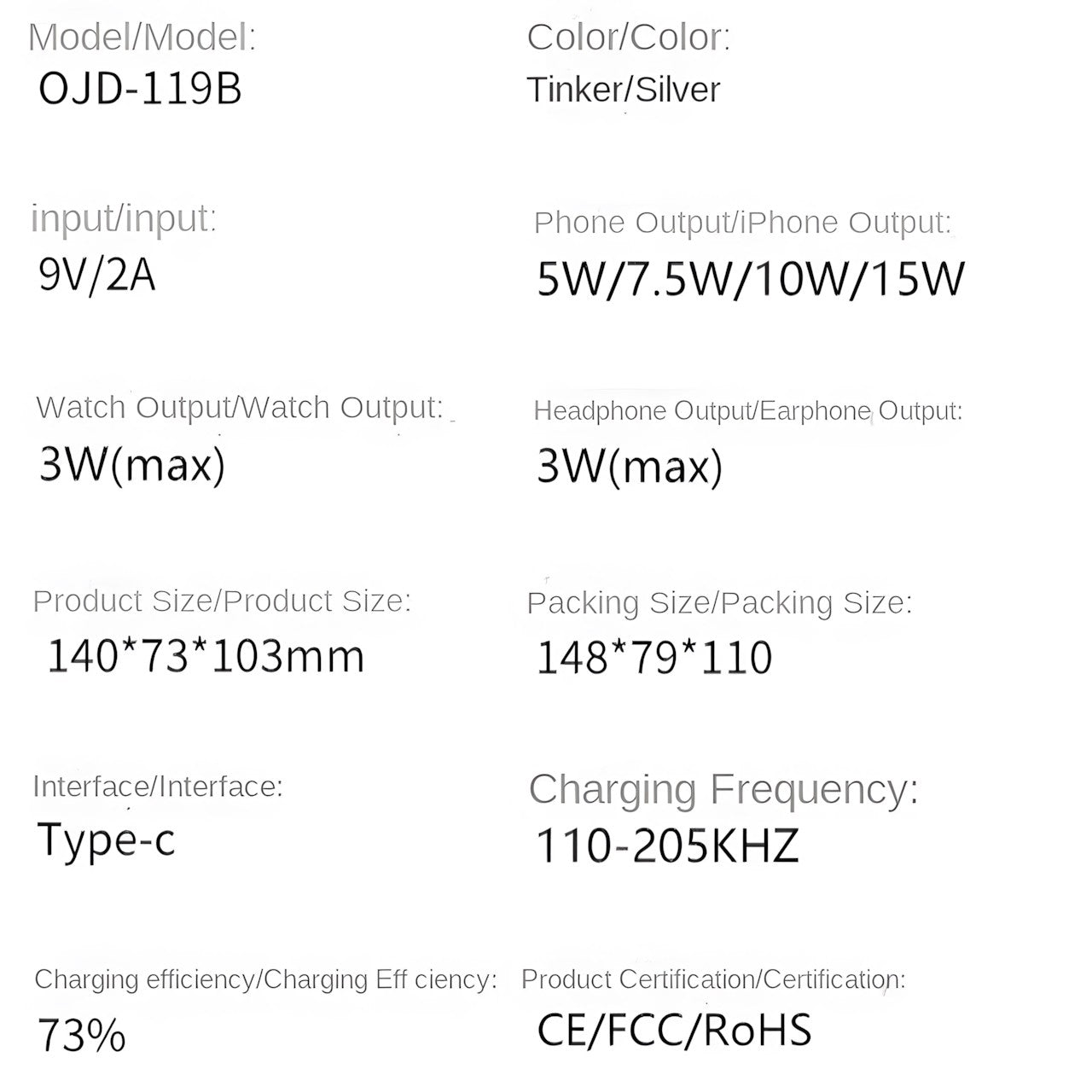 OJD-119B是一款磁性三合一无线充电器,由铝合金制成,支持符合QI标准的手机。