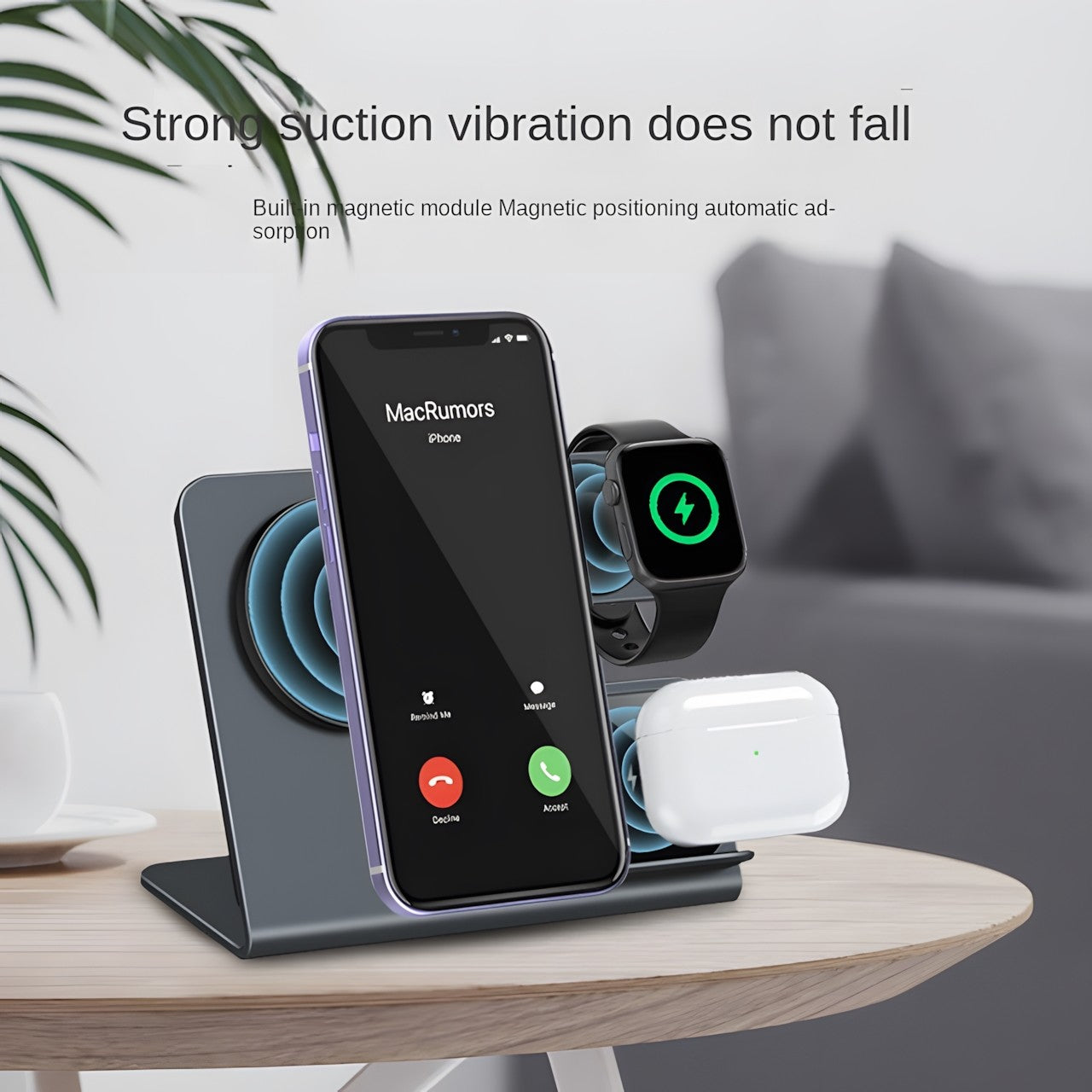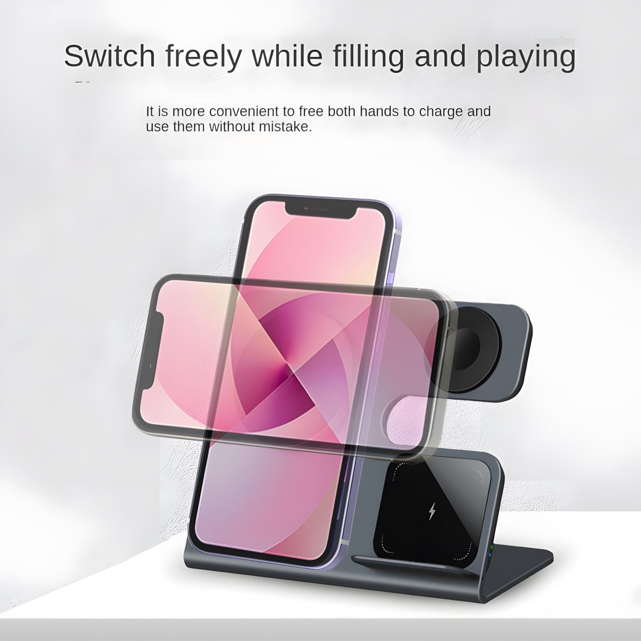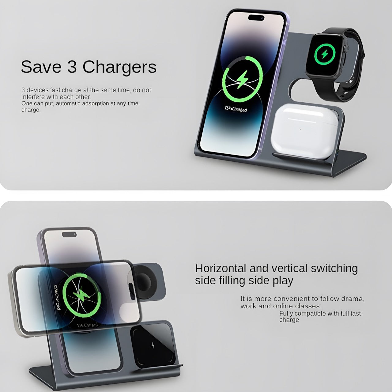 同时 3 合 1 无线充电:使用这款高效的 3 合 1 无线充电站同时为您的手机、智能手表和耳塞充电,旨在简化您的充电程序。
