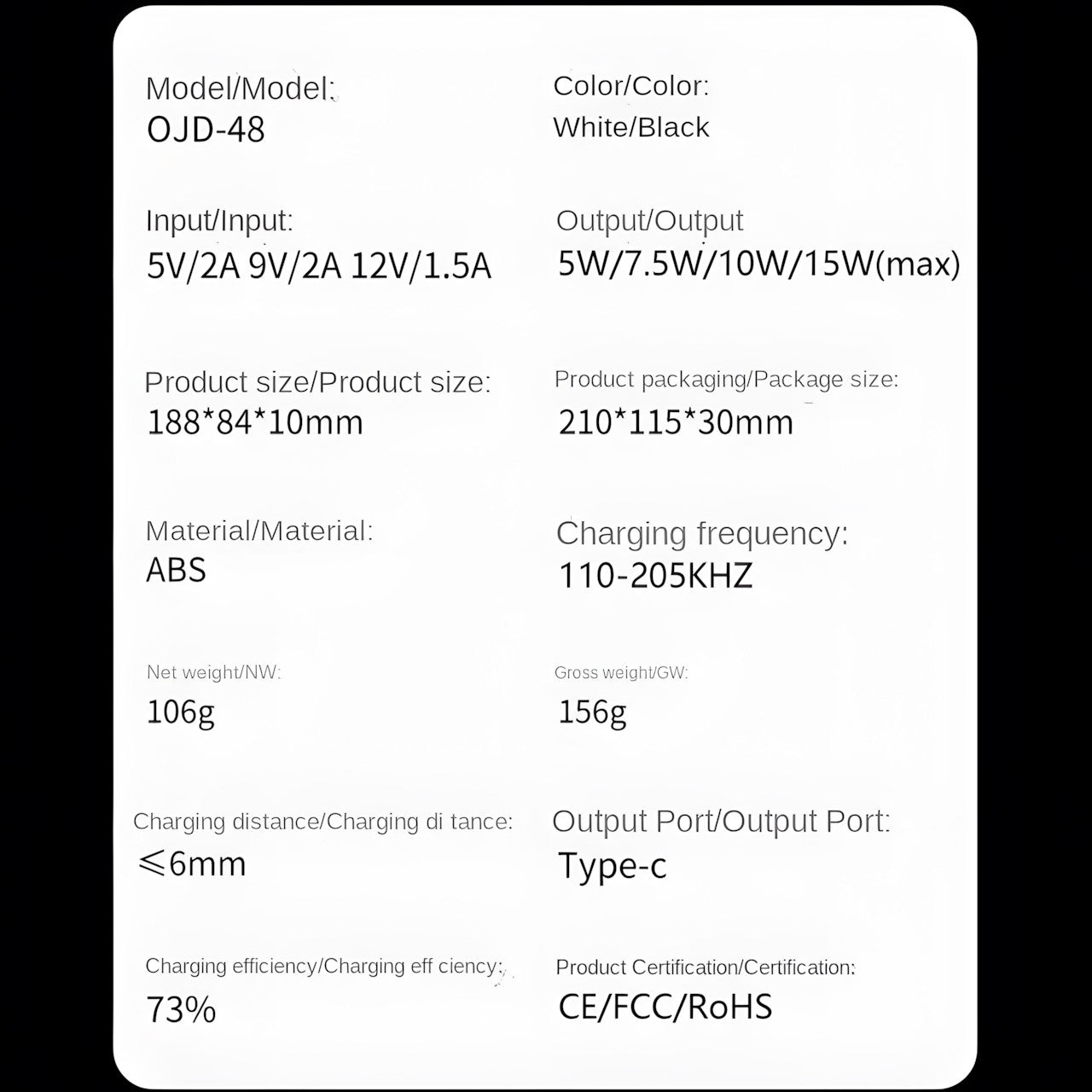 产品亮点:OJD-48是一款三合一无线充电器,省去了有线充电和插拔的繁琐;支持符合QI标准的手机无线充电。
