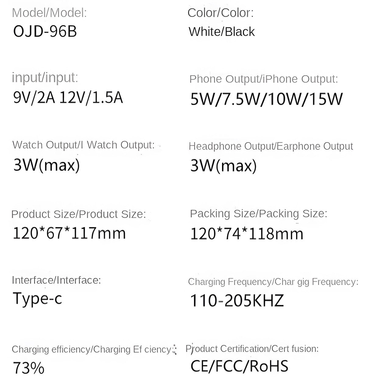 Product highlights: OJD-96 is a vertical three-in-one wireless charger, which is compact and portable; it supports charging mobile phones, earphones and watches that meet QI standards at the same time. Optional charging head.