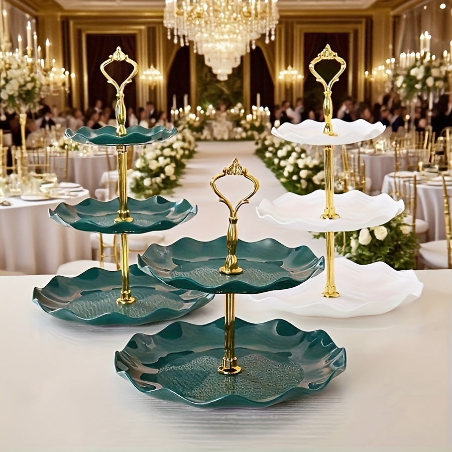 Tiered serving stand are carved with wavy edges, the surface is smooth and shiny, full of elegant and romantic feeling. Crown handle design, easy to carry.
