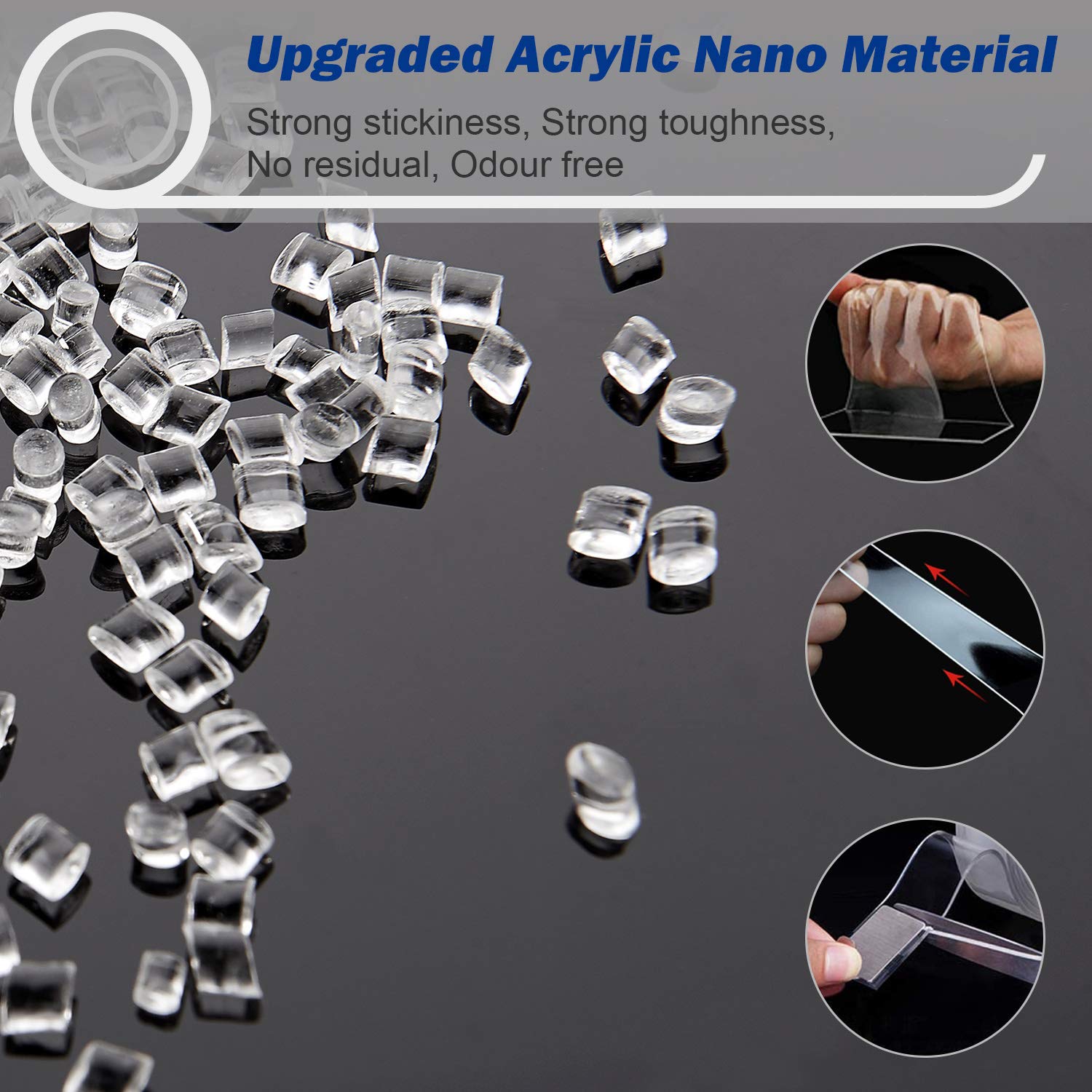 Made from the latest Acrylic-Gel material, our transparent adhesive tapes are very strong,durable,removable,traceless,