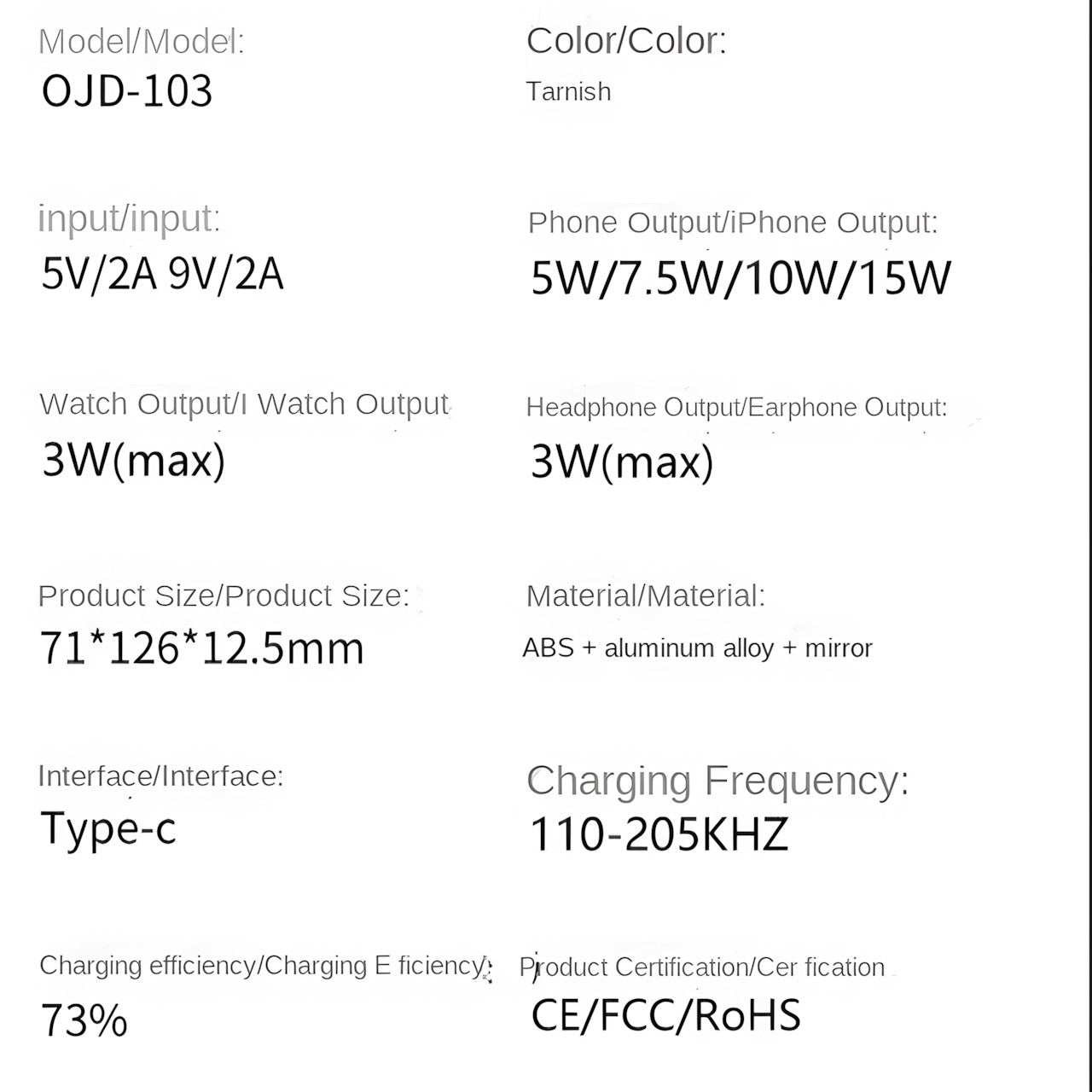 Product highlights: OJD-103 is a car wireless charger, which can be fixed in the car central control trend through a fixed clip; at the same time, it supports wireless charging for mobile phones that meet QI standards.