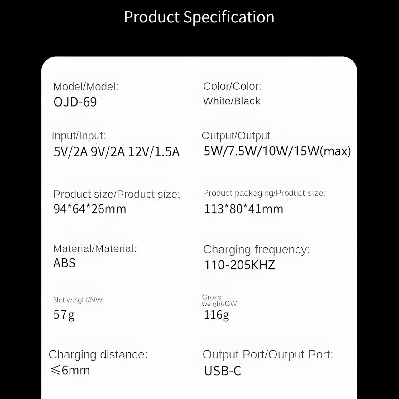 Product output: 5W/7.5W/10W/15W