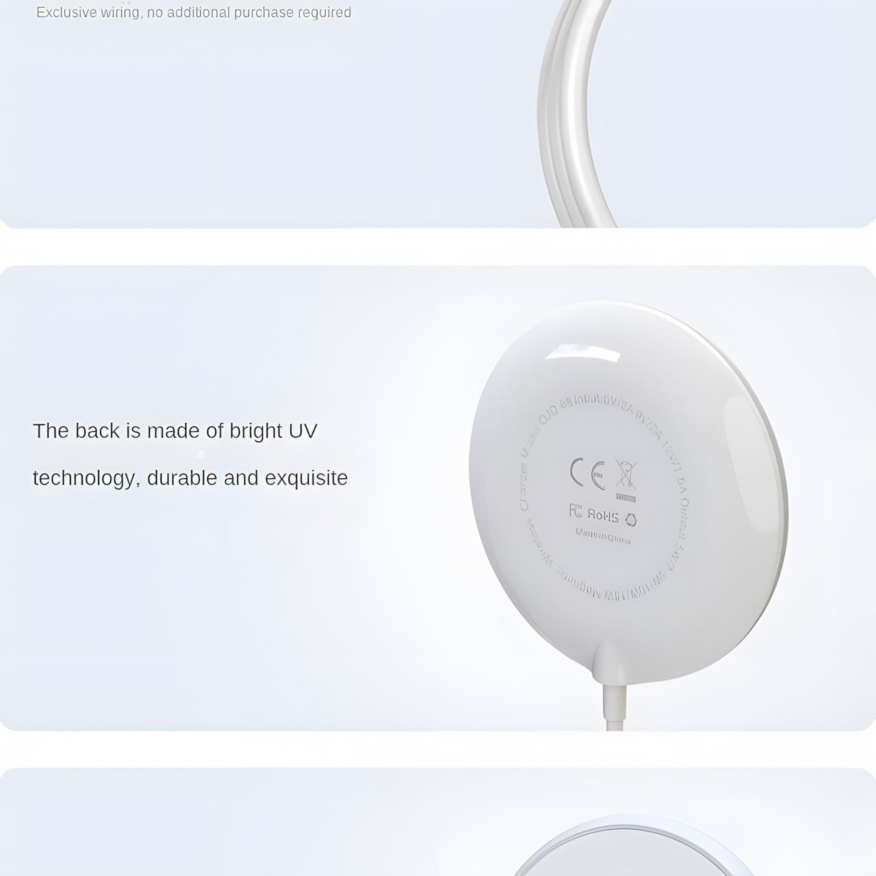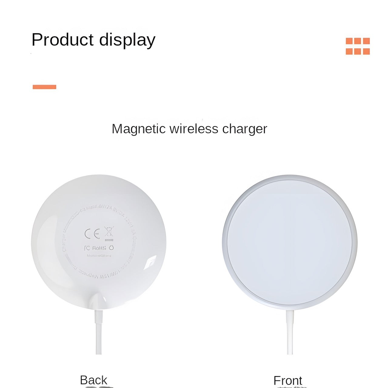 Sleek and Minimalist Design: This magnetic wireless phone charger features a clean and modern design that seamlessly fits into any workspace or home decor, providing a stylish and efficient charging solution.