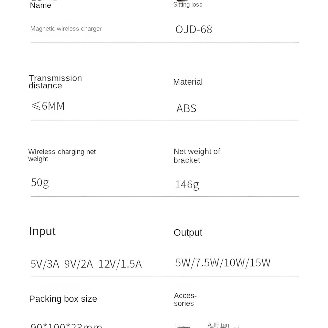 Product highlights: OJD-68 is a magnetic wireless charger, which eliminates the tediousness of wired charging and plugging; supports wireless charging for mobile phones that meet QI standards.
