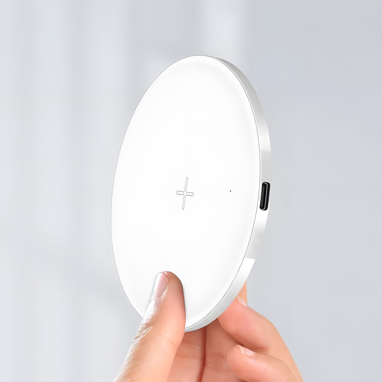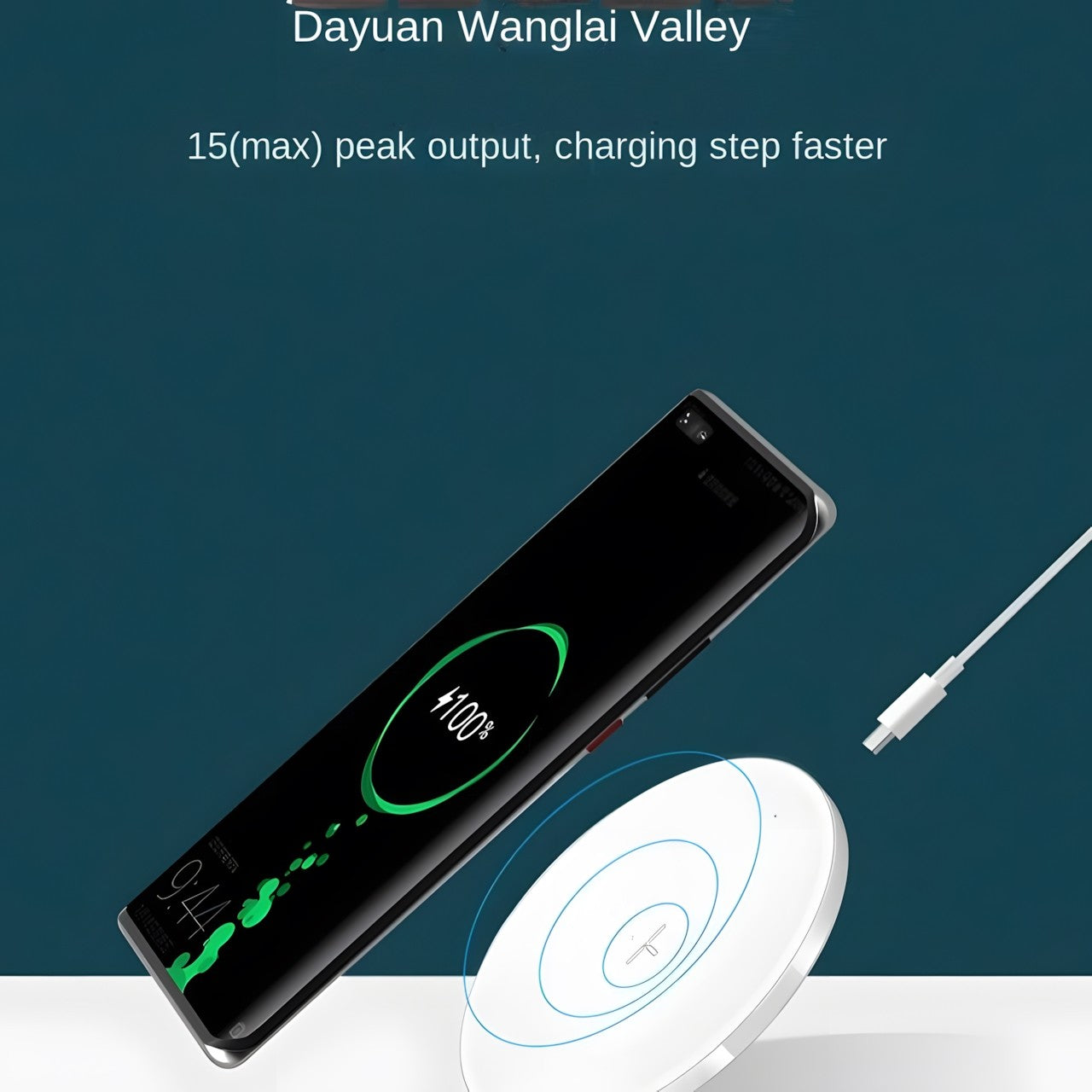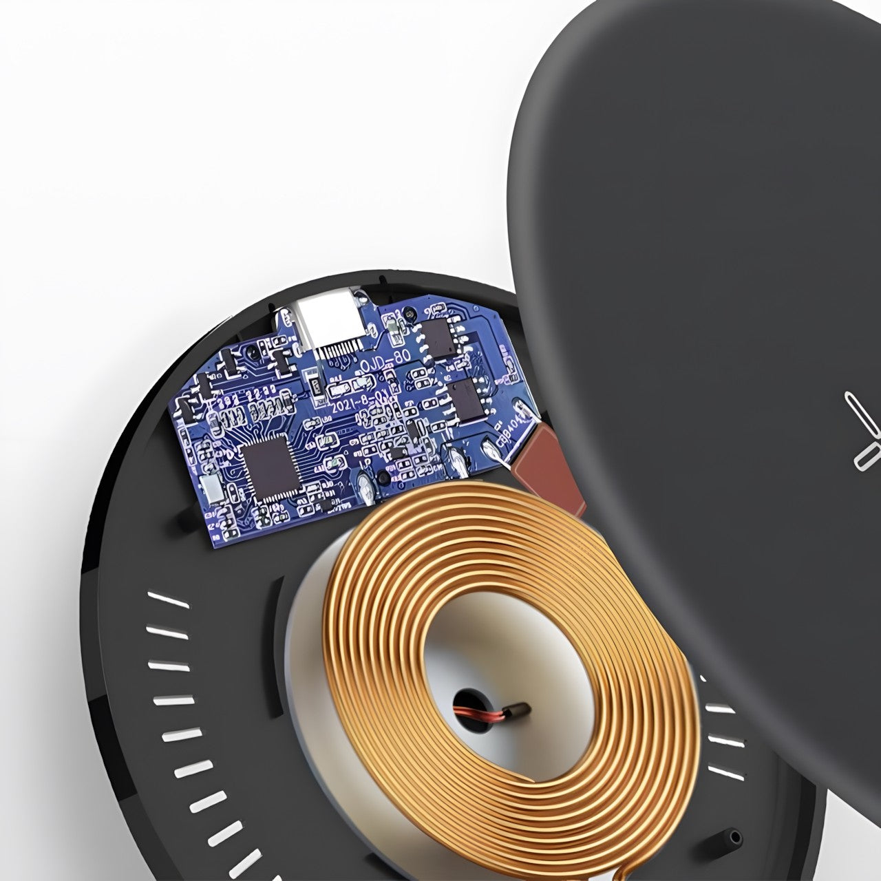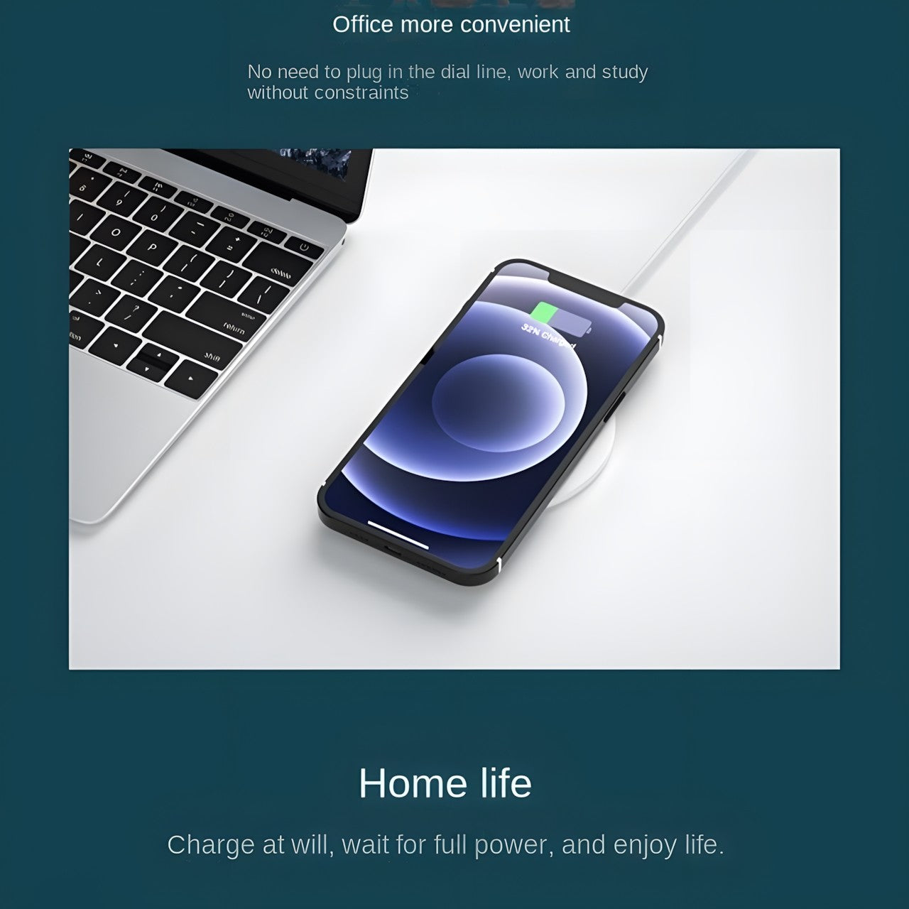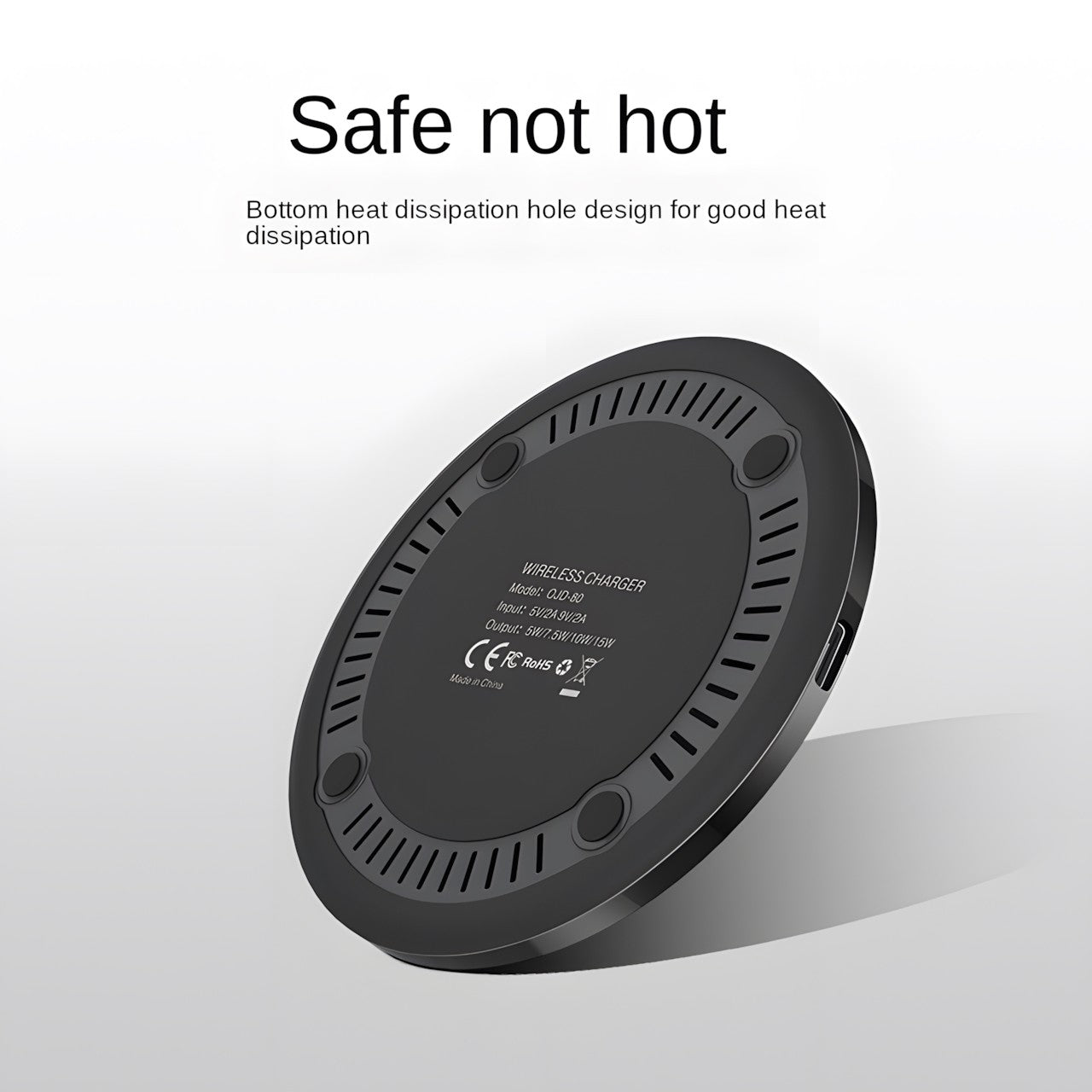 Sleek and Modern Design: This minimalist round desktop wireless charger features a clean and elegant design, seamlessly blending into any workspace or home decor, providing a stylish and efficient charging solution.